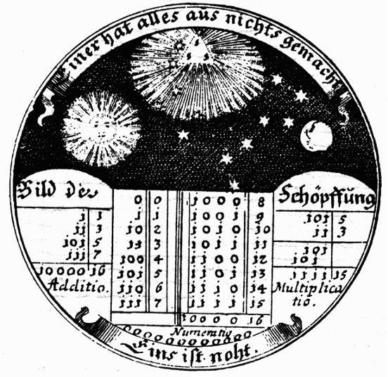 莱布尼茨遵循毕达哥拉斯学说,声称万物的起源或本质是一个数字。众所周知,在二进制数字系统中,所有的数字都可以用0和1来表示。莱布尼茨把0解释为“无”,把1解释为“上帝”,他认为二进制系统象征着创造,因此一切都可以用这个系统表达。对莱布尼茨来说,一切都是0和1的组合。根据这一理论,万物都来自“1”,也就是上帝。
