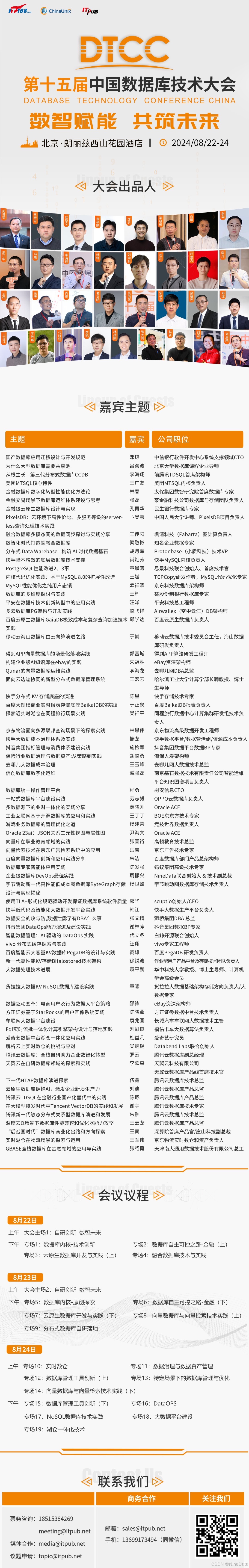 2024年8月22日至24日,由IT168联合旗下ITPUB、ChinaUnix两大技术社区主办的第15届中国数据库技术大会(DTCC2024),将在北京·朗丽兹西山花园酒店隆重召开。NineData 联合创始人周振兴受邀参会,并将带来《企业级数据库DevOps最佳实践》的主题分享。