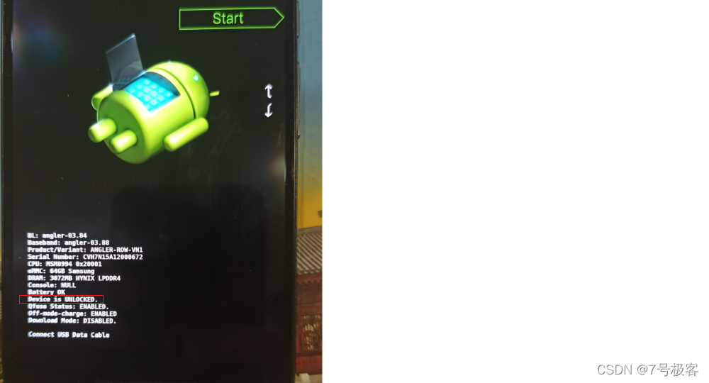3.9、按start开机,将手机处于开机状态并通过数据线连接入电脑,从twrp-3.4.0-0-angler.img文件所在的目录中进入