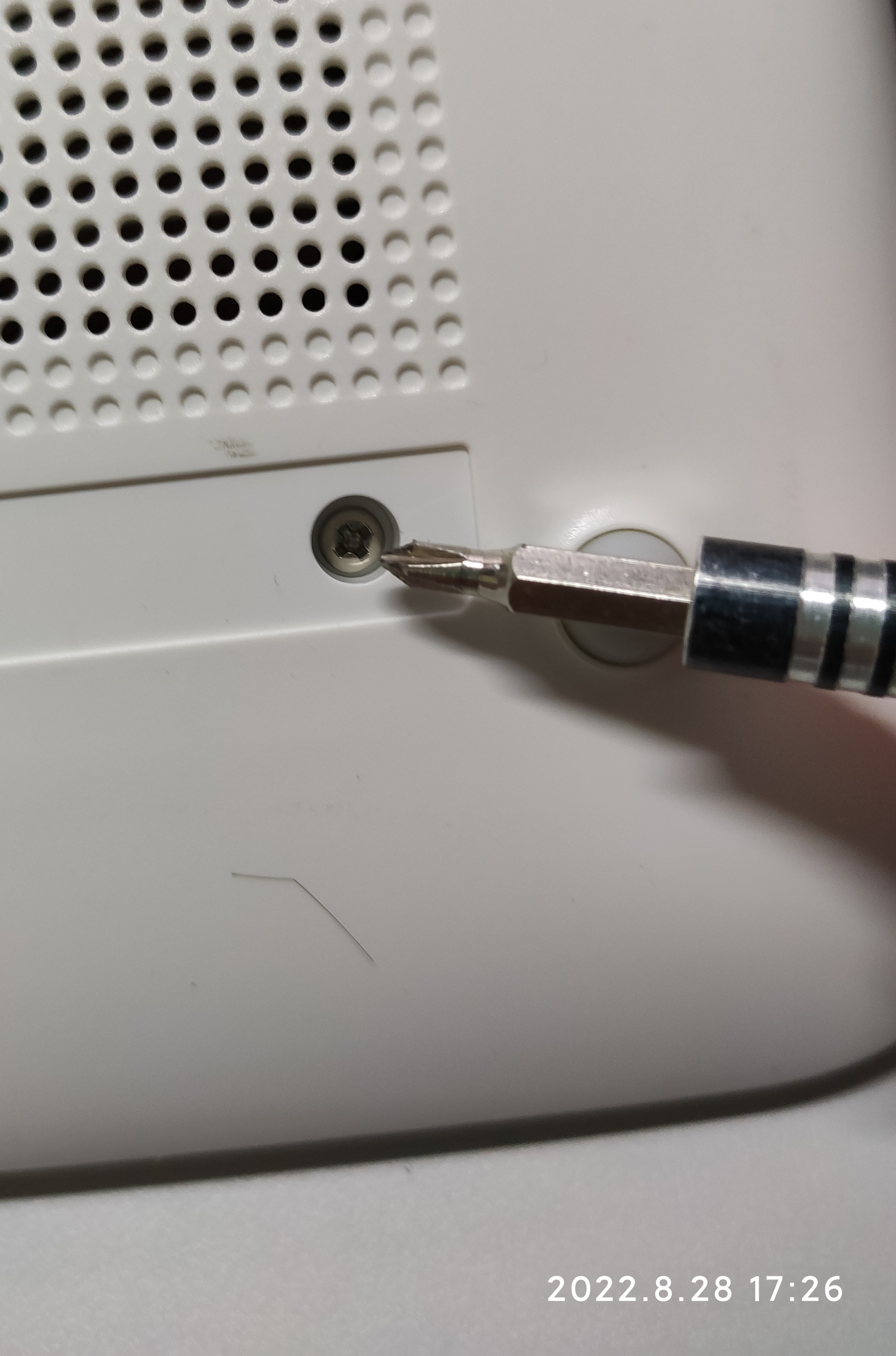 将底部贴纸撕开,即可看到固定路由器的两个螺丝。卸下,并使用翘片 撬棍等工具,将其拆卸。(此处有暴力出奇迹)