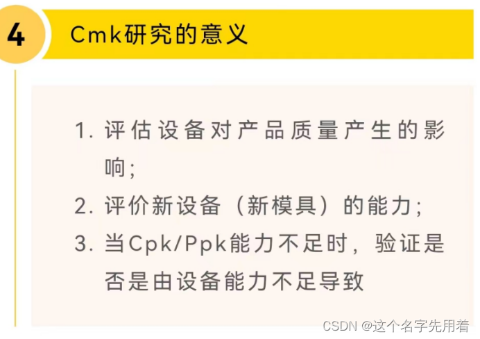 Cmk 是指机器(设备)的能力指数(m是指机器或设备)。研究的对象是设备,表现为某设备加工某零件,在某公差情况下的加工一致性。