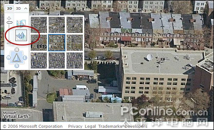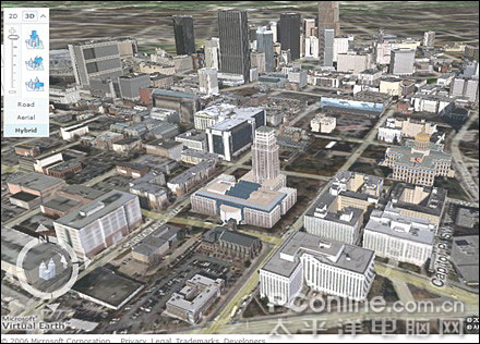 图5 (+上图可点击放大) 要切换到3D模式非常简单,我们只要在控制手柄处点击一下“3D”按钮,再按照屏幕的提示,下载并安装好一个3D插件就可以了。而当插件安装完毕之后,Virtual Earth会首先弹出一个选项页面,让我们选择一下3D模型的渲染级别,如图6所示。其实这个选项的含义非常简单,从左到右分别是“最低精度”、“中等精度”和“最高精度”,而它们之间的区别除了效果不同之外,对电脑的要求也是节节攀升的。 【小提示】 Virtual Earth的3D插件目前仅能安装在英文版操作系统中,这点请大家注意。