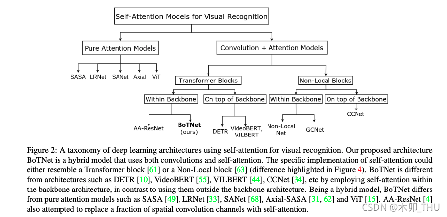 作者也相当坦诚啊:We note that the architectural design of the BoT block is not our contribution. Rather, we point out the relationship between MHSA ResNet bottleneck blocks and the Transformer with the hope that it improves our understanding of architecture design spaces [47, 48] for self-attention in computer vision.作者的贡献不在于提出 BoTNet 的结构,而在于揭示它和 Transformer 原始结构的内在联系。