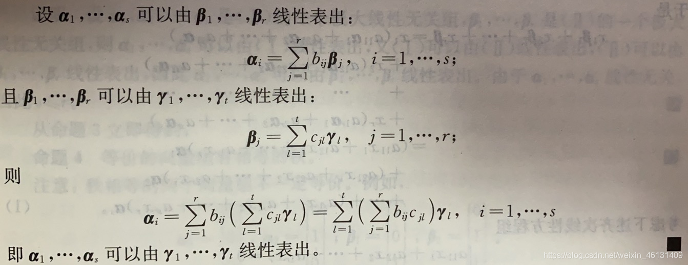 定理4(替换定理):设 α 1 , α 2 . . . α s α_1,α_2…α_s α1,α2...αs线性无关, β = b 1 α 1 + . . . + b s α s \beta=b_1α_1+…+b_sα_s β=b1α1+...+bsαs,如果 b i ≠ 0 b_i≠0 bi=0,则用 β \beta β替换 α i \alpha_i αi后,向量组 α 1 . . . α i − 1 , β , α i + 1 . . . α s α_1…α_{i-1},\beta,α_{i+1}…α_s α1...αi−1,β,αi+1...αs仍线性无关;如果 b i = 0 b_i=0 bi=0,则用 β \beta β替换 α i \alpha_i αi后,向量组 α 1 . . . α i − 1 , β , α i + 1 . . . α s α_1…α_{i-1},\beta,α_{i+1}…α_s α1...αi−1,β,αi+1...αs线性相关