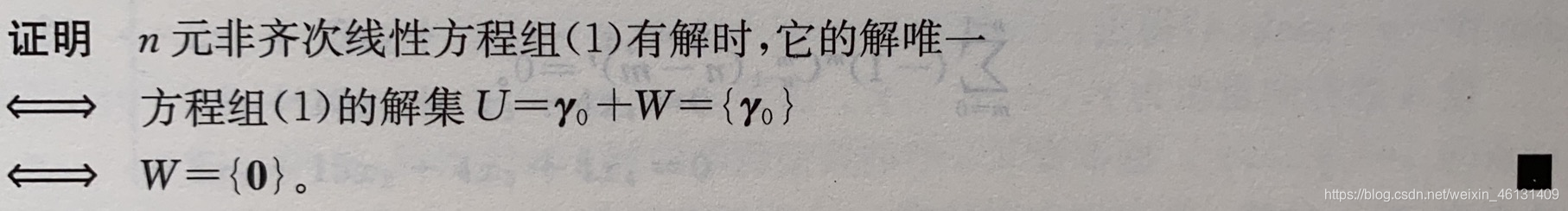 γ0+η∣η∈W}其中 γ 0 γ_0 γ0是(1)的1个解,称为特解;W是其导出组(2)的解空间