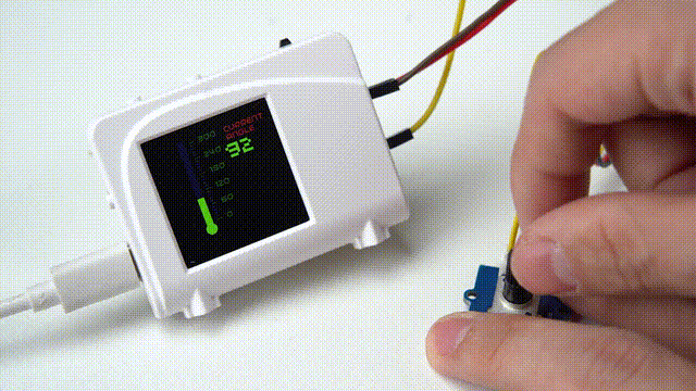我们来演示使用MCU 读取显示角度传感器的数据。这是一款电位计式的角度传感器,它的量程为300度。当前状态指示为90度。逆时针旋转电位计,角度显示增大。顺时针旋转,角度减小。