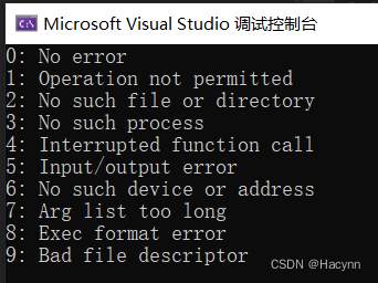 int main() { int i = 0; for ( i = 0; i < 10; i++) { printf("%d: %s\n", i, strerror(i)); } return 0; }