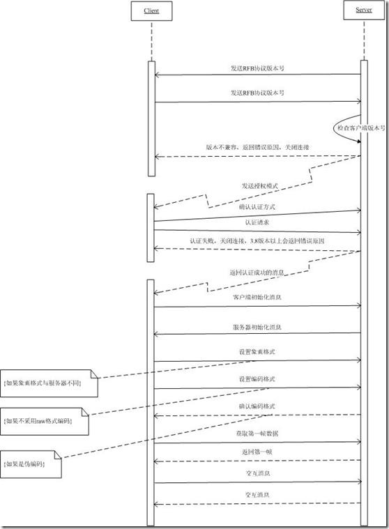 RFB客户端和服务器最初的交互包括协商将要传输的象素数据的格式和编码类型。协商被设计成使客户端的工作尽可能的简单。底线是服务器必须可以一直提供客户端想要的象素数据的格式。但是如果客户端可以处理多种编码类型,它会选择对服务器来说最容易生成的编码。