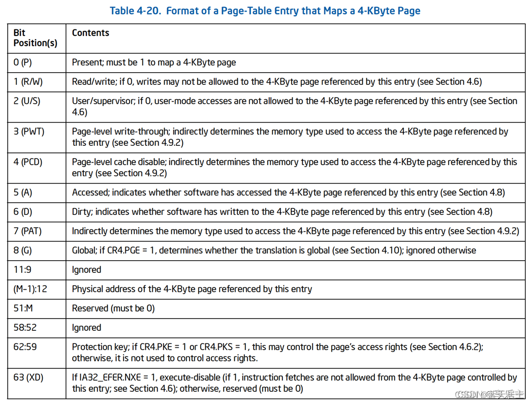 - Dirty flag:bit 9脏页标志位,当CPU对该页表项指向的物理页进行写操作时,会将Dirty flag置位。