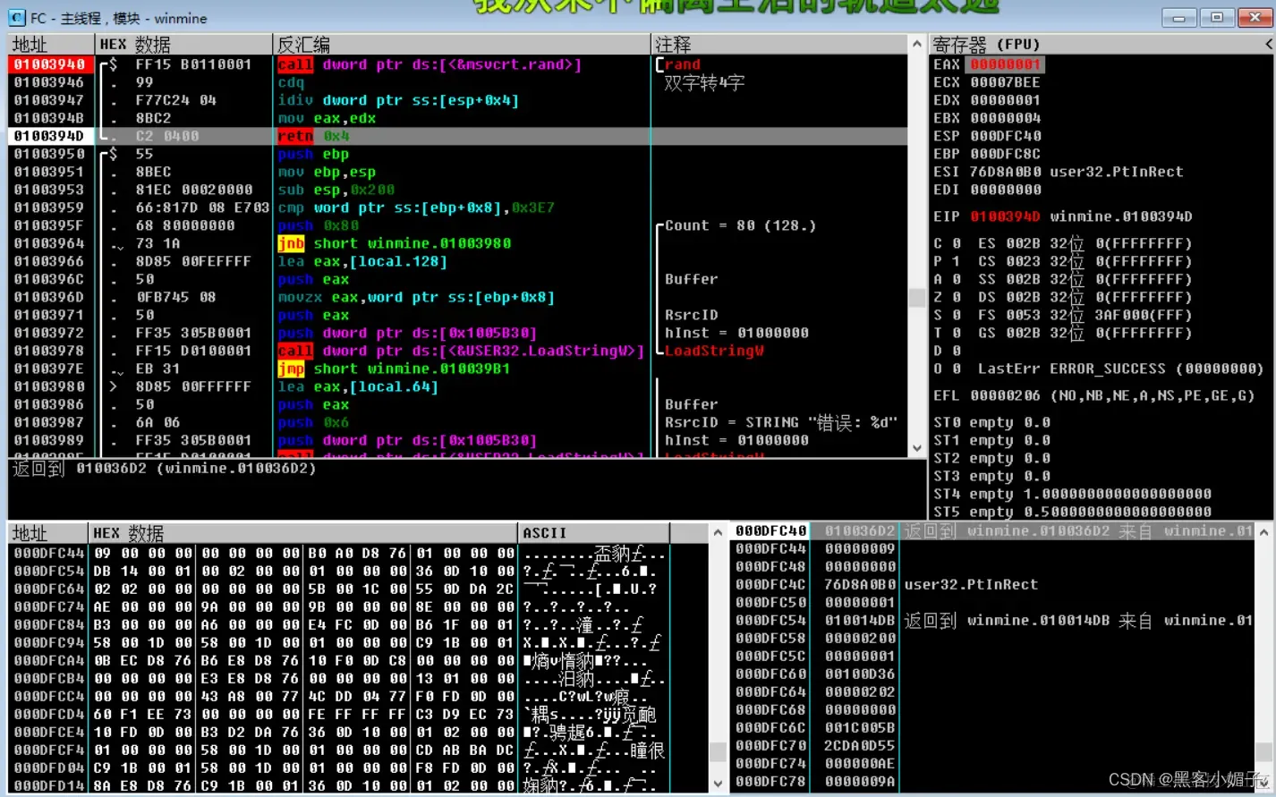 打开OD(工具),把扫雷拖放到OD中,F9运行;ctrl+G输入要跟随的表达式,输入rand,点击【确定】,跳转到该函数调用处,F2设置断点,此次是想通过API rand函数来找寻突破口。在扫雷窗口的雷区中任意点击一个位置(图片中出现2的位置),再点击还原(【笑脸】按钮-