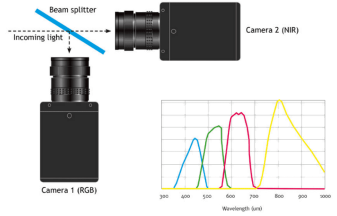 解决与多个独立相机方法相关的问题的一种方法是引入一个分束器元件,该元件通过分光导入到多个相机进行光谱图像采集。比如下图集成了一个RGB相机与一个NIR相机。