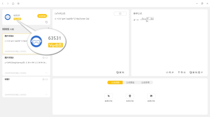 支持公式图像到 LaTeX,公式图像到 Microsoft Word,公式图像到 TSV(粘贴到 Excel 和 Google 工作表)等。拍照识别:使用手机进行拍照取图,直接生成电子版数学公式。
