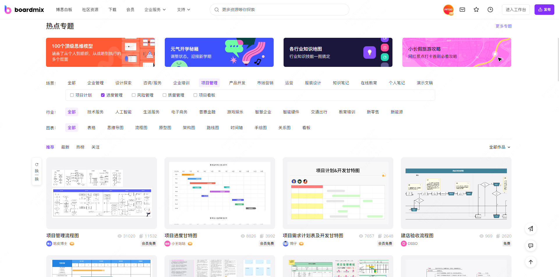 获取boardmix甘特图模板:在浏览器打开boardmix模板社区首页,选择项目管理 > 进度管理场景,就能一键筛选出甘特图模板。