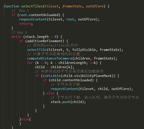 在Key2中,就是一个LOD策略的实现,上图给出了追加的逻辑注释。Cesium目前支持两种方式Add追加和Replace替换两种方式。Add方式较为简单,是Tiles求并的思路,而Replace是覆盖的思路,较为复杂,因为要控制父子节点直接的可见不可见,从代码来看,Cesium在这一块处理的比较简单,应该会出现闪烁的效果,不知道是否有人可以证实这个推测是否正确?