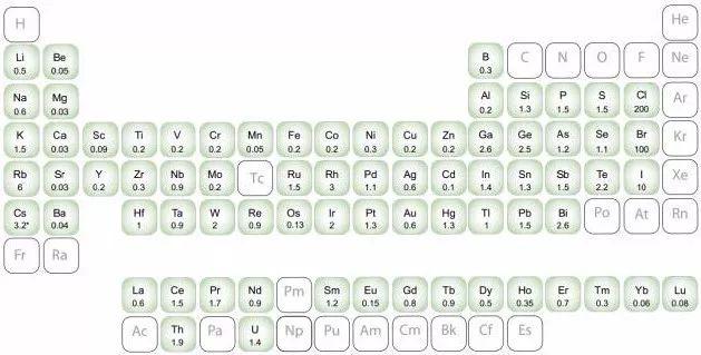 ICP-MS具有极低的检出限,其溶液的检出限大部份为ppt级,石墨炉AAS的检出限为亚ppb级,但由于ICP-MS的耐盐量较差,ICP-MS的检出限实际上会变差多达50倍,一些轻元素(如S、Ca、Fe、K、Se)在ICP-MS中有严重的干扰,其实际检出限也很差。ICP-MS的检测元素和检测极限如下图: