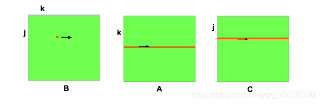 矩阵B中第k列,与矩阵A的第k行第i列的中的元素分别相乘得到矩阵C中的第i列元素的值,可以看到矩阵B和矩阵C的访问都不是顺序的,因此速度就最慢。