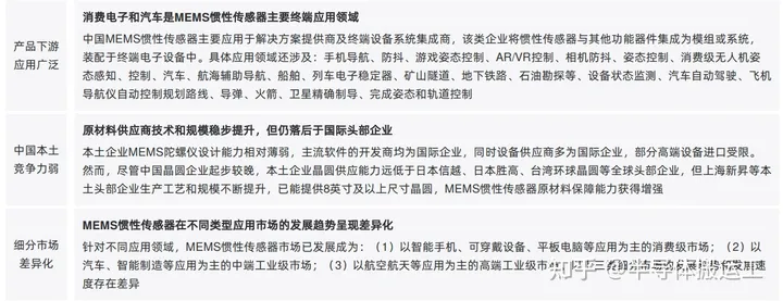 3. 中国MEMS惯性传感器行业特征 惯性传感组合(IMU)是基于MEMS技术的惯性传感器组合,由加速度计和陀螺仪共同组成,基于加速度计和陀螺仪原理,测量功能全面,可测量空间多 个方向的加速度和角速度。其行业特征包括产品下游应用广泛、中国本土竞争力弱、细分市场差异化。